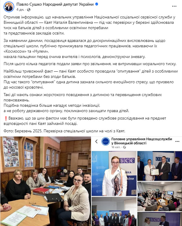 «За наявними даними, посадовиця вдавалася до дискримінаційних висловлювань щодо спеціальної школи, публічно принижувала педагогічних працівників, називаючи їх «Космосом» та «Нулем», махала пальцями перед очима вчителів і психологів, демонструючи зневагу. Після цього кілька педагогів подали заяви про звільнення, не витримавши морального тиску», – зазначив парламентар.