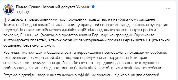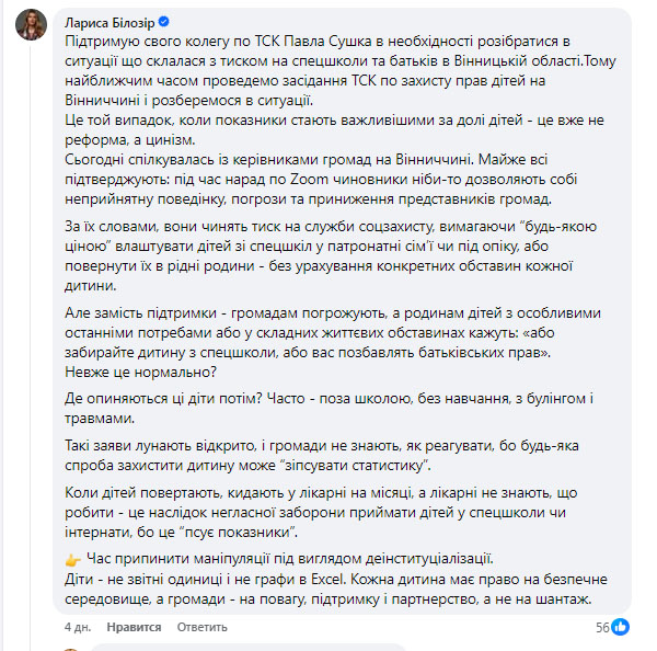 Депутатка від групи «Довіра» Лариса Білозір підтримала колегу по ТСК Павла Сушка в необхідності розібратися в ситуації, що склалася з тиском на спецшколи та батьків в Вінницькій області. Вона анонсувала виїзне засідання ТСК.