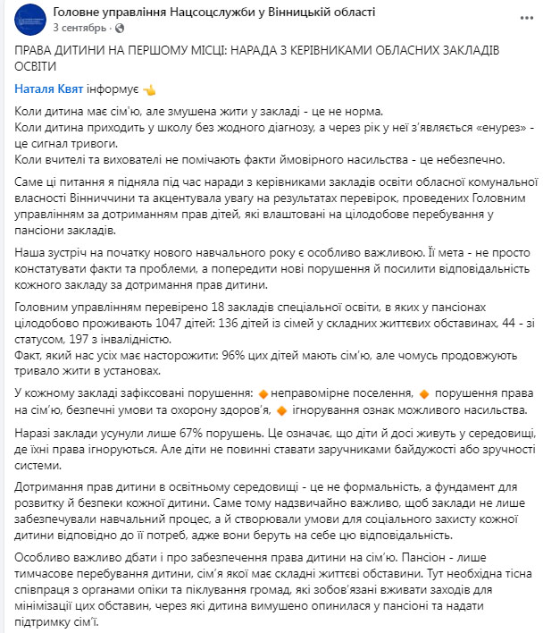 «Головним управлінням перевірено 18 закладів спеціальної освіти, в яких у пансіонах цілодобово проживають 1047 дітей: 136 дітей із сімей у складних життєвих обставинах, 44 – зі статусом, 197 з інвалідністю. Факт, який нас усіх має насторожити: 96% цих дітей мають сім’ю, але чомусь продовжують тривало жити в установах», – зазначила Наталя Квят.