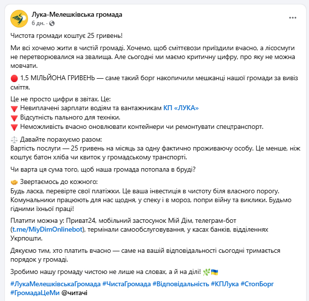 Лише тиждень тому у місцевих пабліках влада Лука-Мелешківської громади нагадувала мешканцям, що чистота коштує 25 гривень. Як буханець хліба. Це місячна платня за одну особу.
