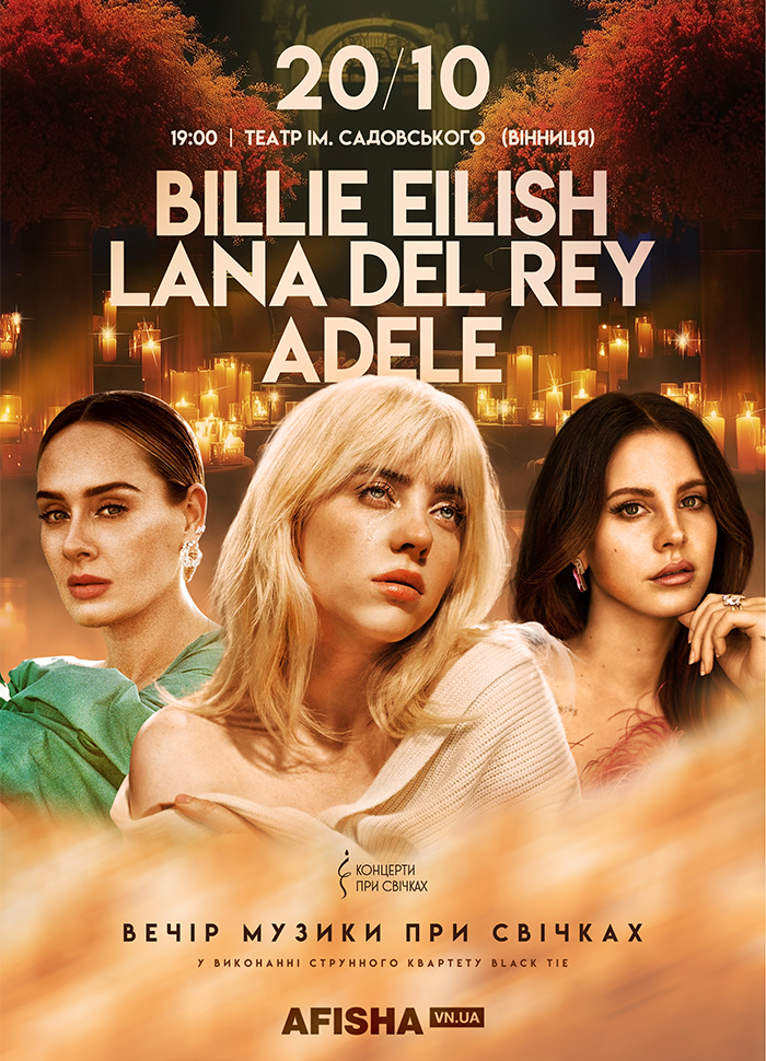 Концерт «Billie Eilish, Lana Del Rey та Adele при свічках» 20 жовтня о 19.00 у Вінницькому театрі ім. Садовського вразить всіх, хто вміє слухати серцем та цінує красу в деталях і силу музики, яка об’єднує покоління.
