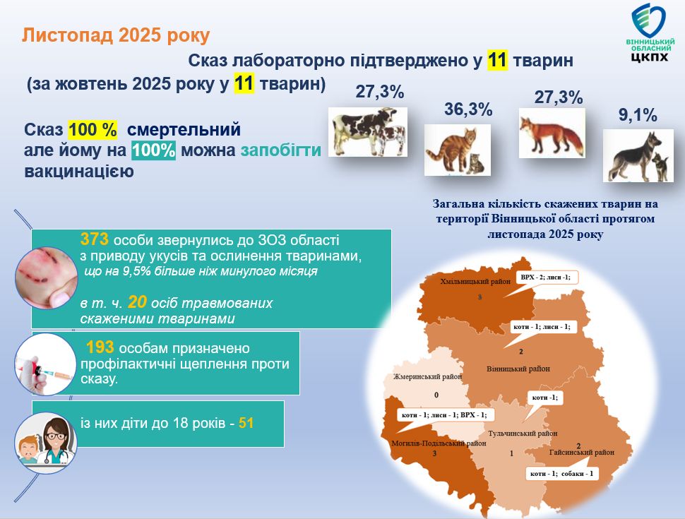 У Вінницькій області зберігається тенденція до зростання кількості інфікованих сказом тварин. Протягом 11 місяців цього року підтверджено зараження 123 тварин, що у 1,6 разів більше, ніж за аналогічний період минулоріч.