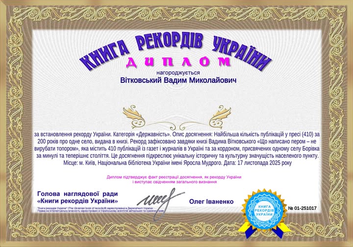 «Вчора у Києві, в Національній бібліотеці України імені Ярослава Мудрого презентували 7-й том історії нашого села Борівка “ЩО НАПИСАНО ПЕРОМ – НЕ ВИРУБАТИ ТОПОРОМ!”. Книга Рекордів України визнала її Новим Рекордом України», – зазначив Вадим Вітковський.
