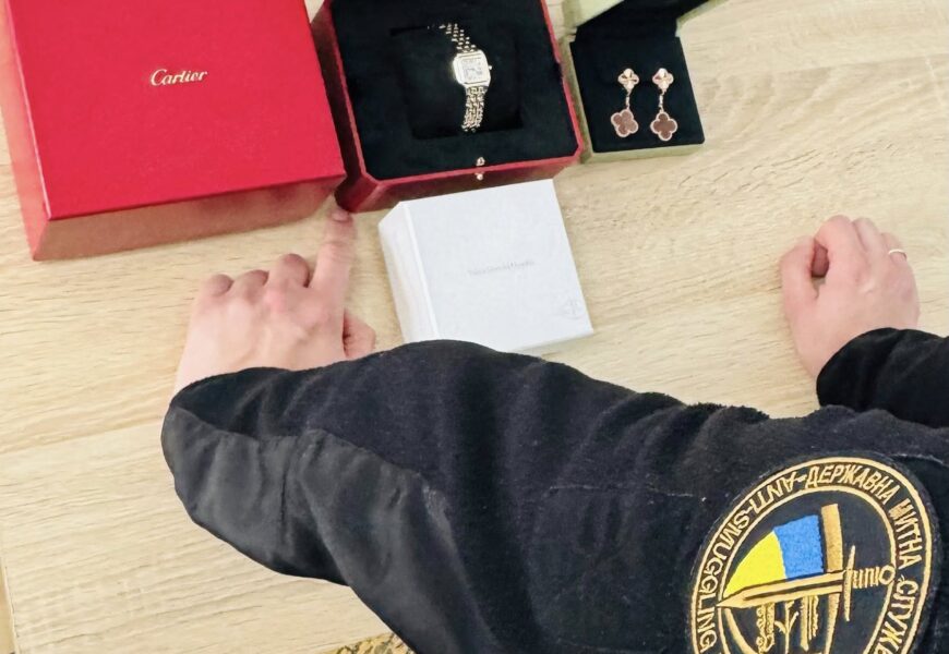 Серед незадекларованих товарів опинились золоті сережки та камінням коричневого кольору з маркуванням «Van Cleef & Arpels», а також платіжний документ, що стосується цього товару, на суму 6300 євро, годинник із металу білого та жовтого кольору з маркуванням «Cartier» та платіжний документ до нього на суму 9800 євро.