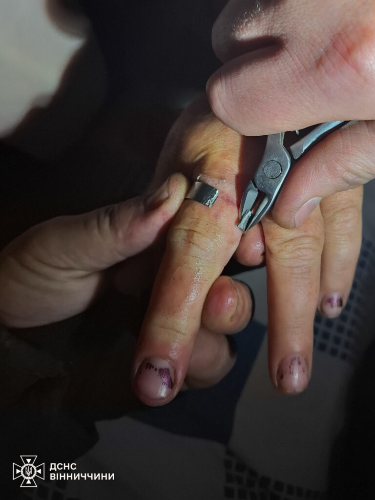 Не тільки обручки можуть стискати пальці. Граючись, 48-річній жительці села Руданське Шаргородської громади син надягнув на палець металеву шайбу. Самотужки зняти її жінка не змогла. Тому довелося викликати рятувальників.