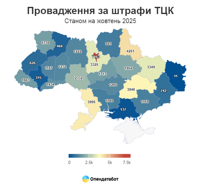 У цілому по Україні 2025 року за порушення правил військового обліку відкрито 47 046 проваджень . Третина з них (14 454) наразі вже завершена. ТЦК відкривають близько 4,5 тисячі проваджень на місяць. Пік «активності» припав на липень (7595).