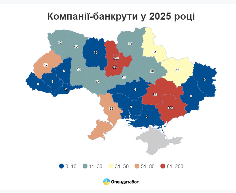 Загалом у 2025 році 780 компаній розпочали процес судового банкрутства. Це близько 10% від загальної кількості припинень бізнесу. Обіги найбільших компаній-банкрутів коливаються від 3,4 до 7,7 млрд грн. Найчастіше банкрутами стають ТОВ — це 84% випадків. Неплатоспроможними торік ставали компанії, що займаються оптовою торгівлею та сільським господарством. За кількістю бізнесів-банкрутів лідирує Київ.