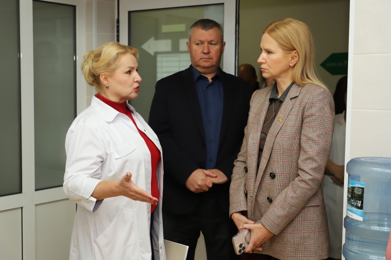 Олена Кондратюк, Вячеслав Соколовий та Анатолій Ткач оглянули низку структурних підрозділів лікарні: Центр ментального здоров’я, консультативну поліклініку, відділення променевої діагностики, відділення анестезіології та інтенсивної терапії й поспілкувалися з медичним персоналом лікарні.