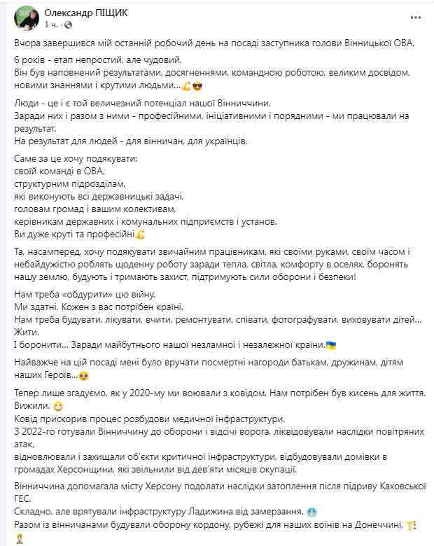 Про своє звільнення Олександр Піщик повідомив у соцмережах. Він подякував «своїй команді, структурним підрозділам, які виконують всі державницькі задачі, головам громад і вашим колективам, керівникам державних і комунальних підприємств і установ».