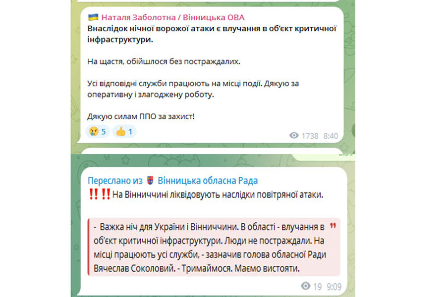 Атаку на регіон підтвердили начальниця Вінницької ОВА Наталя Заболотна та голова облради Вячеслав Соколовий.