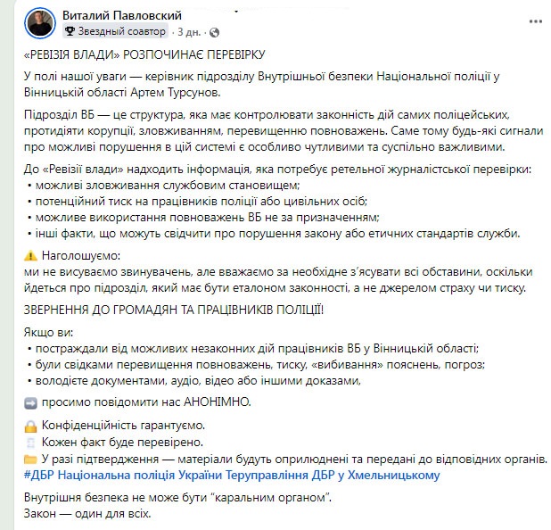Про все по черзі. Громадська організація «Ревізія влади» опублікувала на своїй сторінці у соцмережі пост про «початок перевірки» керівника підрозділу внутрішньої безпеки Нацполіції у Вінницькій області Артема Турсунова. Зазначається, що до ГО надходить інформація, яка потребує перевірки, тому закликають звертатися  «анонімно» громадян і працівників поліції, які постраждали від працівників ВБ чи були свідками їхньої протиправної діяльності. Факти обіцяють перевірити. Якщо підтвердяться, їх передадуть до Держбюро розслідувань. Також у ГО наголошують, що «закон один для всіх».