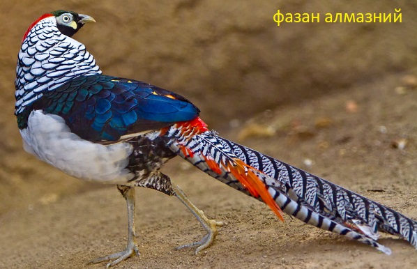 Фазан алмазний – також виходець зі сходу. Його батьківщина – Тибет, М’янма, південь Китаю, де птаха можна зустріти високо в горах, іноді, на висоті до 4 500 метрів над рівнем моря. Алмазний фазан дуже добре маскується і ховається у бамбукових заростях, малодоступних колючих чагарниках.