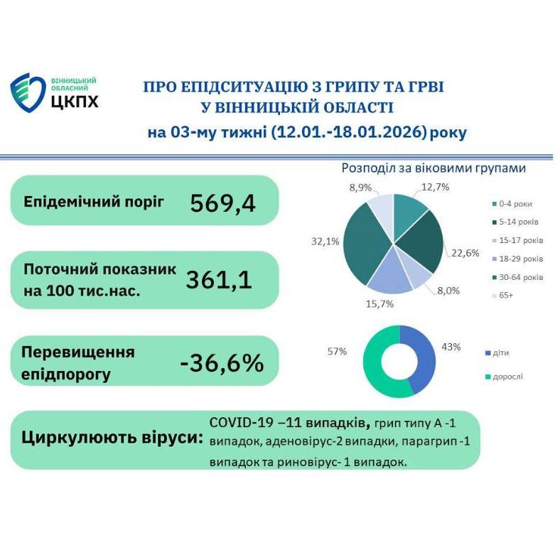 Втім, у регіоні лабораторно підтверджено випадки захворюваності на COVID-19 (11 випадків), грип типу А (1 випадок), аденовірус (2), парагрип (1) і риновірус (1). Тож можна стверджувати, що Вінниччиною «ходять» всі найнебезпечніші інфекції, притаманні зимовому періоду.
