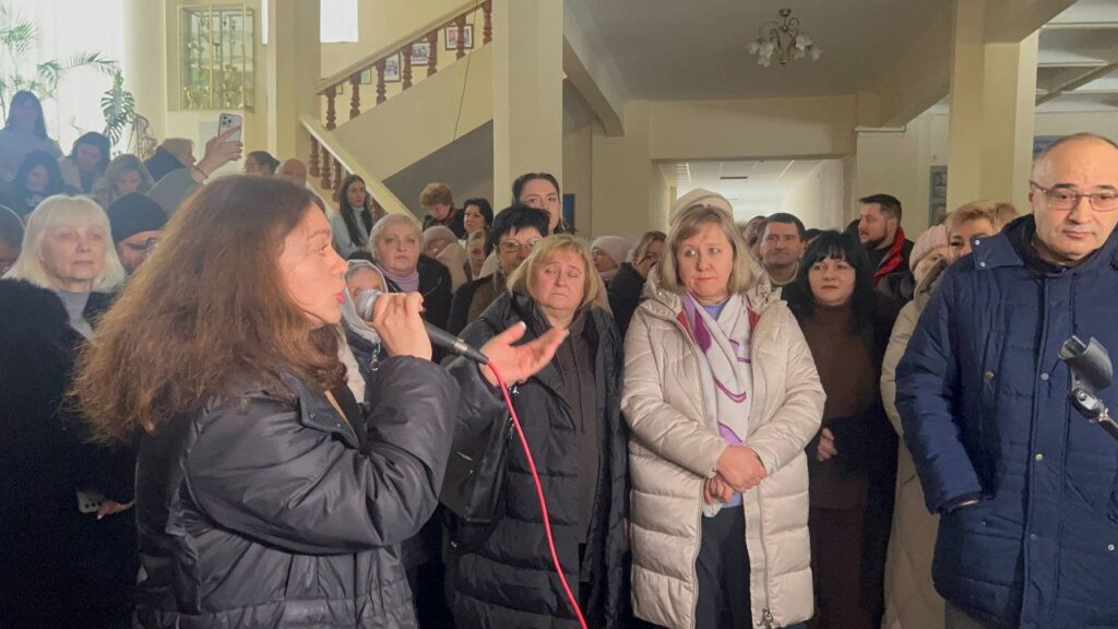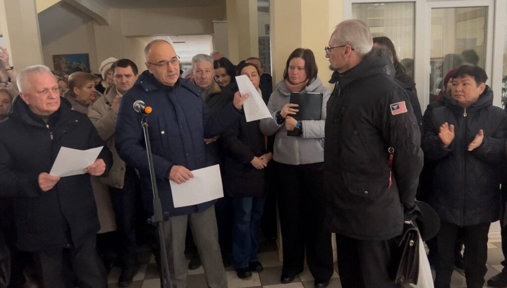 Сьогодні ранком близько 50 педагогів у фойє адмінкорпусу зібрались на протест. На їхню думку, нещодавнє призначення в.о. ректора Вячеслава Мирошниченка, доцента кафедри фізвиховання Маріупольського педуніверу, його скарги на нібито складності з демократичним волевиявленням колективу, «відстрочка» з проведенням виборів повязана виключно з бажанням нав’язати конкретну особу – діючого нардепа від «Слуги народу» Анатолія Драбовського, обраного по 12-му округу у Вінниці.