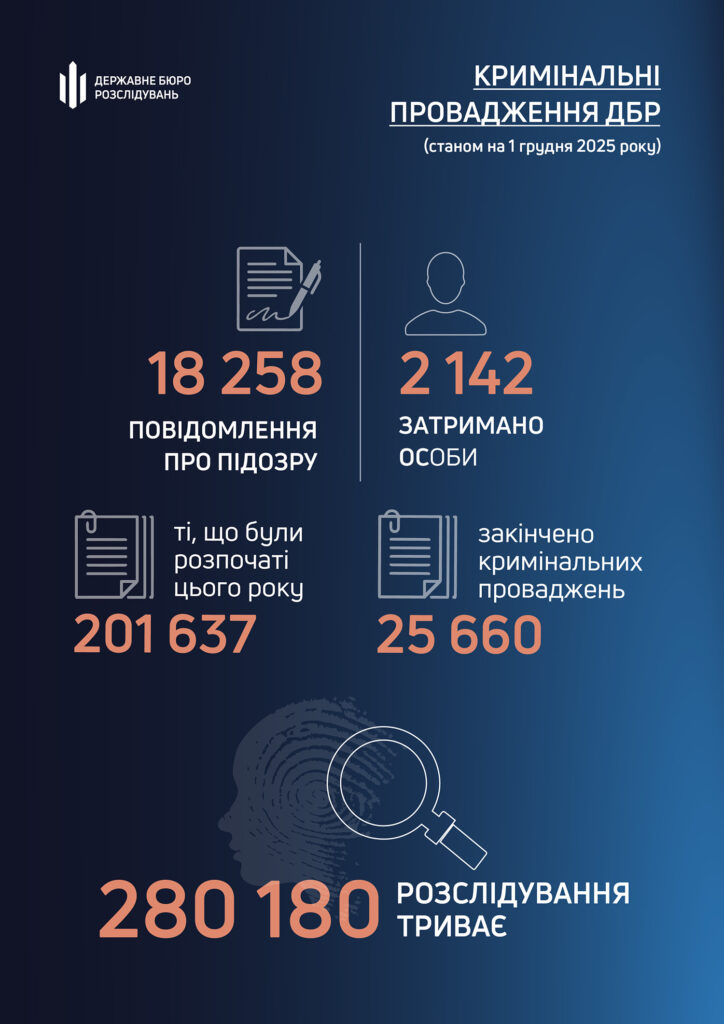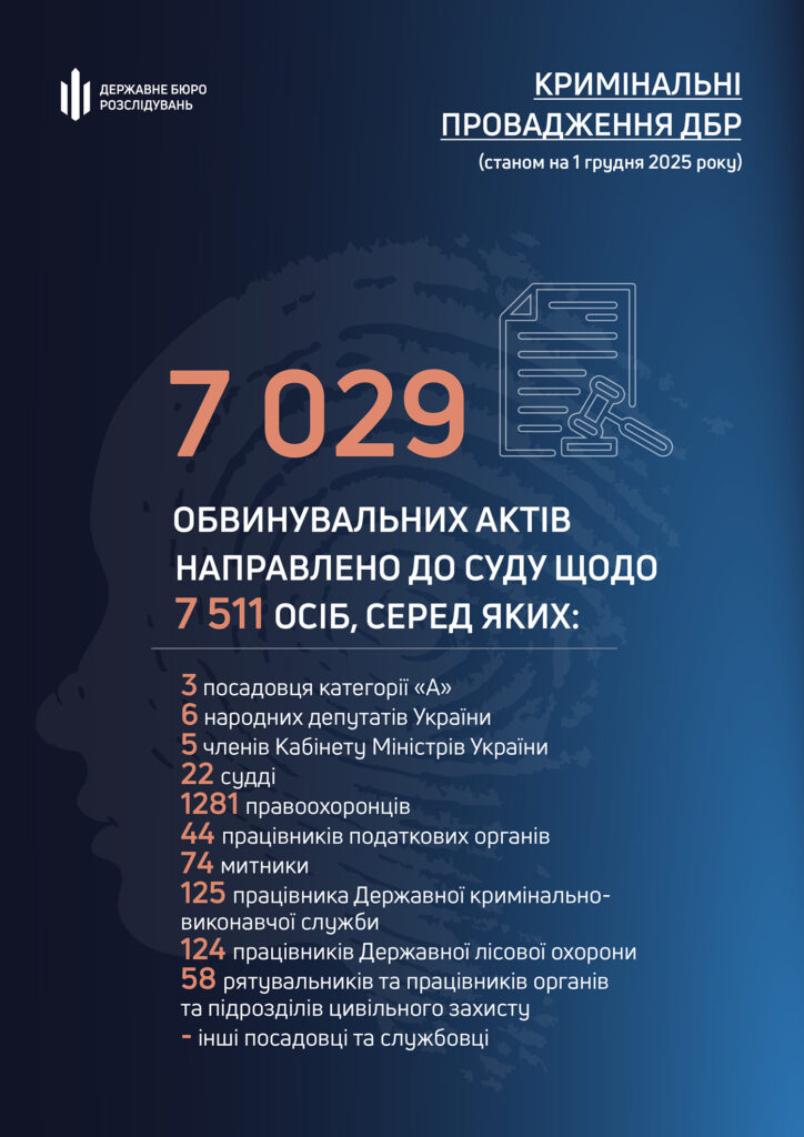 За січень – листопад 2025 року слідчі ДБР завершили досудове розслідування та направили до суду понад 7 тисяч 029 обвинувальних актів щодо 7 тисяч 511 осіб.