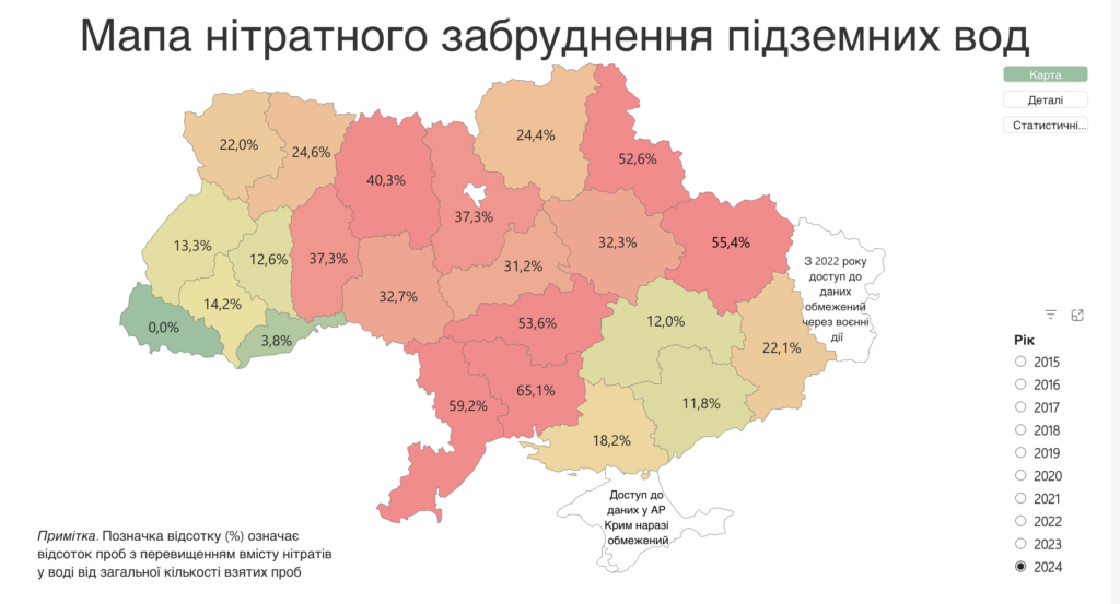 В Україні опублікували інтерактивну мапу нітратного забруднення підземних вод. Створила її ГО «Екодія» на основі результатів лабораторних досліджень, які проводять обласні центри контролю та профілактики хвороб МОЗ. Мапа охоплює дані за 2015–2024 роки.