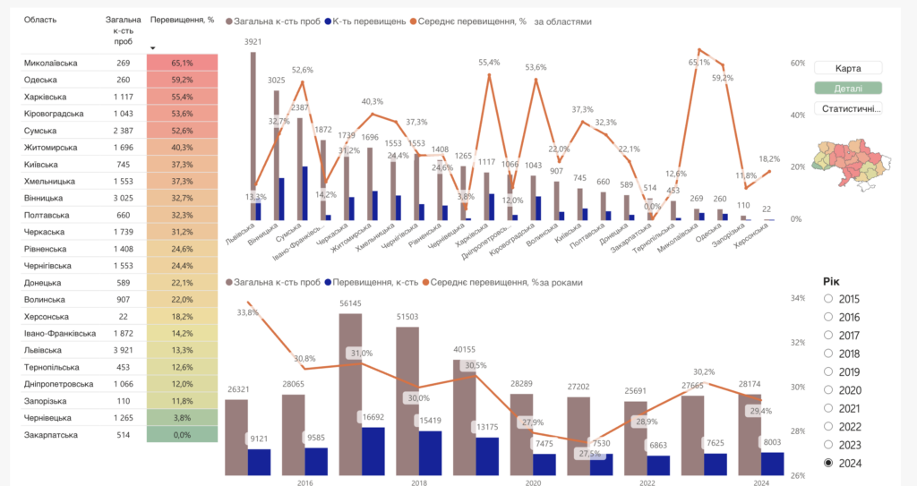 Найвищі відсотки перевищень зафіксовані на Миколаївщині (65,1%), Одещині (59,2%) та Харківщині (55,4%). Натомість на заході України ситуація стабільніша: у Закарпатській області немає жодної проби з перевищенням.