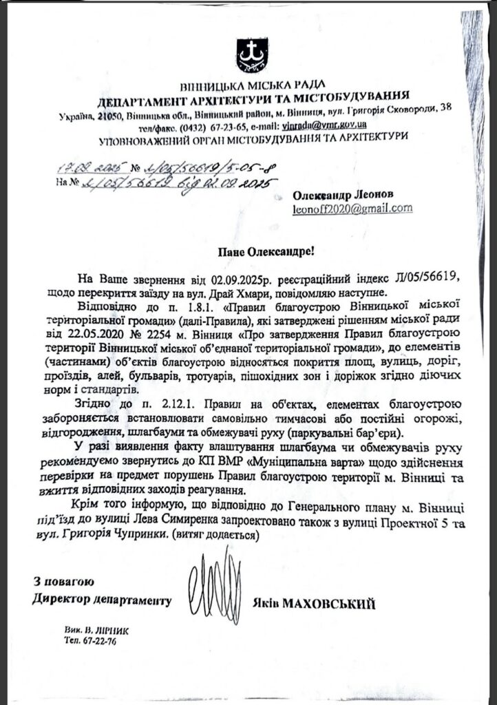 Генпланом не передбачено наскрізного проїзду до інших вулиць. Підтверджується це також відповіддю на інформаційний запит директором департаментом архітектури та містобудування міськради Яковом Маховським.