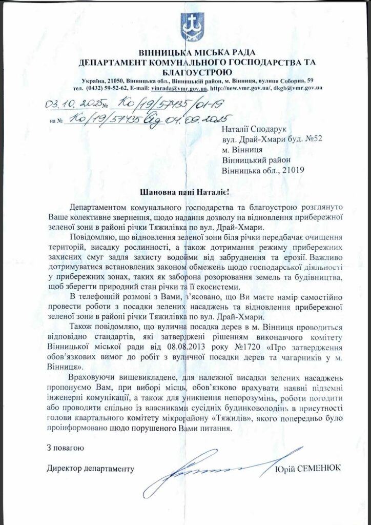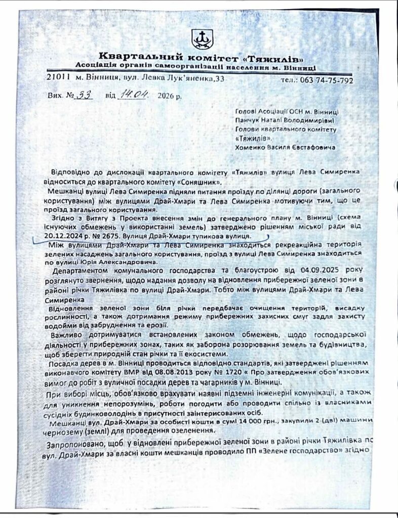 У Вінниці мешканці вулиці Драй-Хмари заявляють про самовільне облаштування проїзду через зелену прибережну зону річки Тяжилівка. За їхніми словами, дорогу насипали щебнем для доступу до ділянки, де триває будівництво відпочинкового комплексу. Вони зібрали безліч документів, аби довести цей факт, але виправити ситуацію не в змозі.
