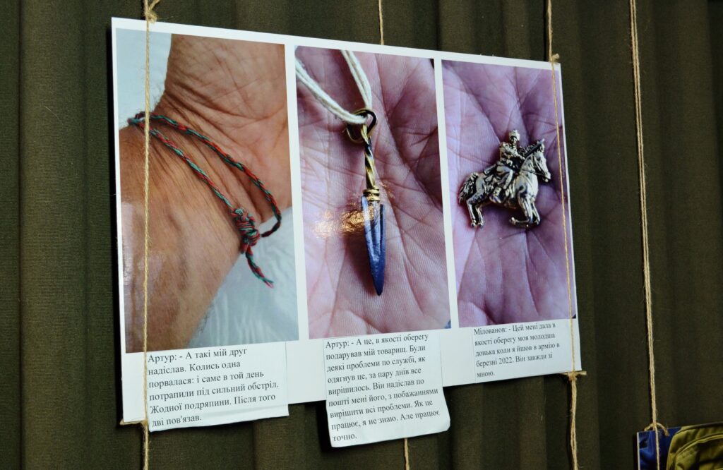 Обереги воїнів різні – іконки, світлини коханих, рідних, і навіть м’які іграшки. Серед оберегів також шеврони, браслети, ланцюжки з різною символікою та багато іншого. Особливо ціннісні обереги матерів полеглих воїнів…