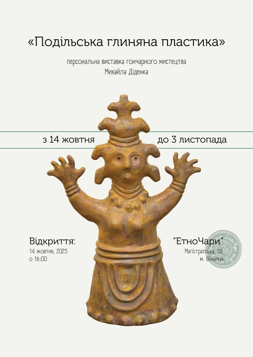 Сьогодні, 14 жовтня, в Артпросторі «ЕтноЧари» у Вінниці відкривається персональна виставка керамічних скульптур та виробів глиняної пластики «Подільська глиняна пластика» Михайла Діденка. Її мета – розвиток і продовження традицій керамічної скульптурної пластики, популяризація її через виставки та майстер-класи.