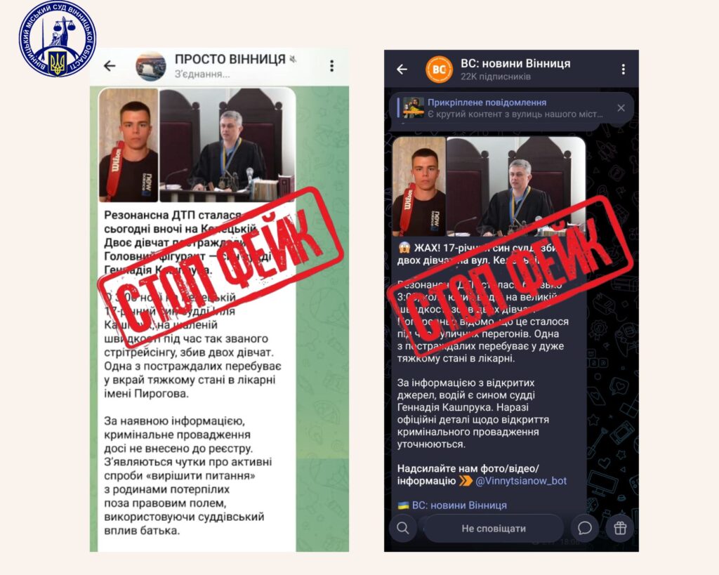 На одному з вінницьких телеграм-каналів було опубліковано інформацію, що до ДТП, внаслідок якого в обласному центрі під час стрітрейсінгу було збито двох дівчат причетний 17-річний син судді Геннадія Кашпрука. У Вінницькому міськсуді заявляють про спробу маніпуляції з боку ресурсу, який перебуває під санкціями РНБО.