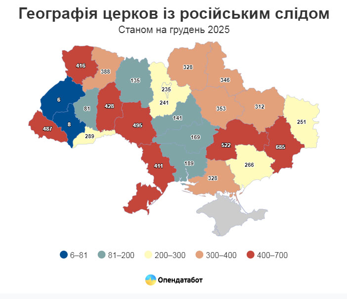Лідером є Дніпропетровщина (522), яка має утричі більше населення. До порівняння не взято до уваги Донеччину (685), адже більша частина регіону окупована, частина парафій існують лише на «папері», храми знищені російськими окупантами, а частина парафіян змінила адресу проживання.