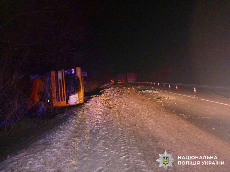Одна людина загинула, одна – травмована внаслідок ДТП, що сталася 19 лютого неподалік с. Туча Вінницького району. У темряві на дорозі зіткнулись дві вантажівки MAN i DAF. Від удару одну з них викинуло на узбіччя.