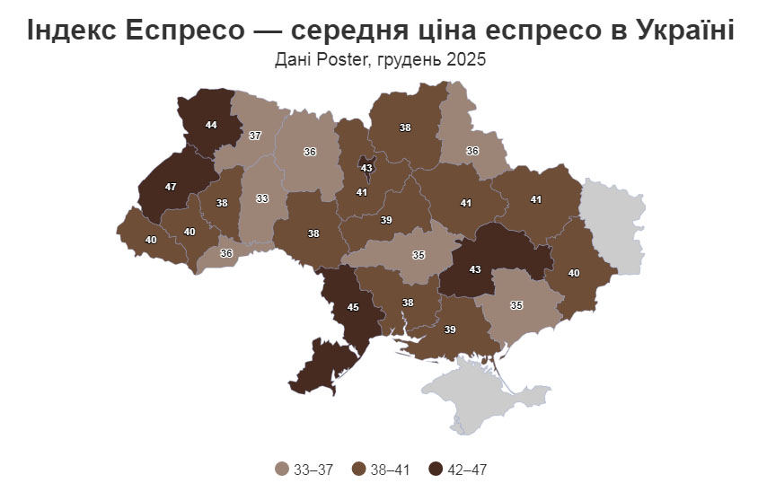 Найдорожче нині еспресо на Львівщині (47 грн), а найдешевше можна посмакувати кавою на Хмельниччині (33). У Вінниці ціни відносно демократичні.