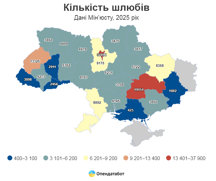 Втім одружень побільшало лише у 3 регіонах: у столиці, на Дніпропетровщині та Львівщині. Загалом кожен четвертий шлюб укладали у Києві — 37 898 одружень. Це у 1,8 раза більше, ніж у 2024 році та навіть у 1,5 раза більше, ніж до початку повномасштабної.